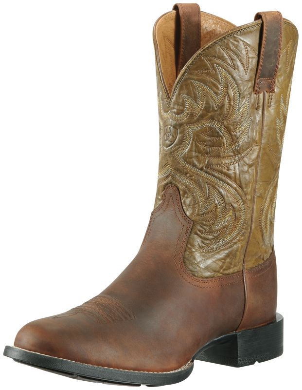 Ariat(R) Men's Heritage Horseman Boots Boots to live in, these feature a traditional W toe, six-row stitching, good looks, and Ariat(R) performance. Flexible Duratread(R) rubber soles are durable and resist barnyard acids. Stability and comfort are the result of ATS (Advanced Torque Stability) Technology that handles the beatings all-day, every-day work and riding dish out. Features: W toe shape Duratread(R) rubber outsoles Exclusive ATS technology 11" Shaft height 1.375" Heel height Item Specifications: Color: Distressed Brown/Army Green